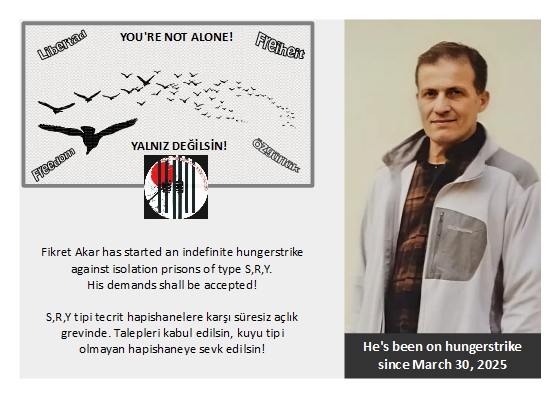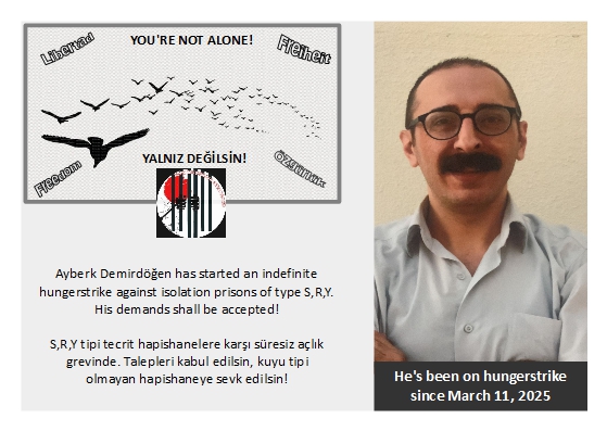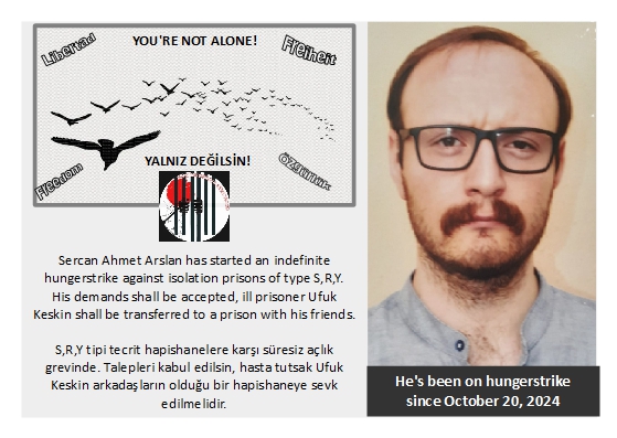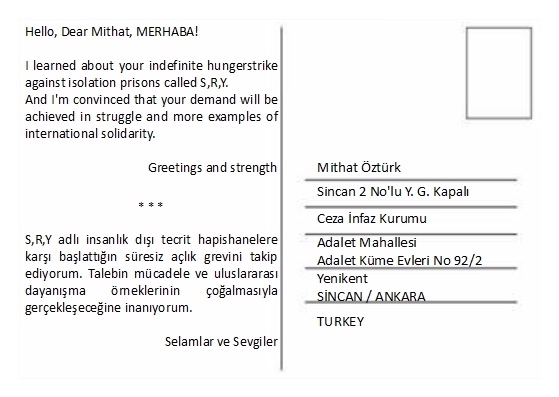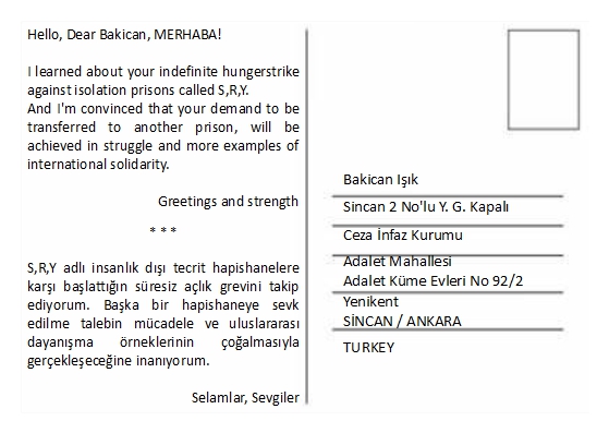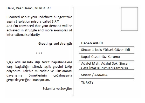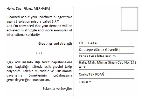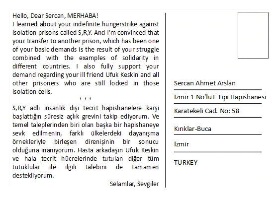 Send a post card to Sercan Ahmet Arslan. His demand to be transfered to another prison was accepted on 7th May, but his hungerstrike continues for over 200 days in order to grant the transfer of his ill comrade Ufuk Keskin as well.