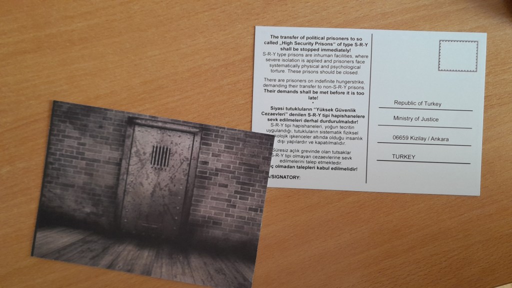 There were written 5 more postcards to be sent to the Turkish Ministry of Justice, demanding the closure of the type S-R-Y isolation prisons.