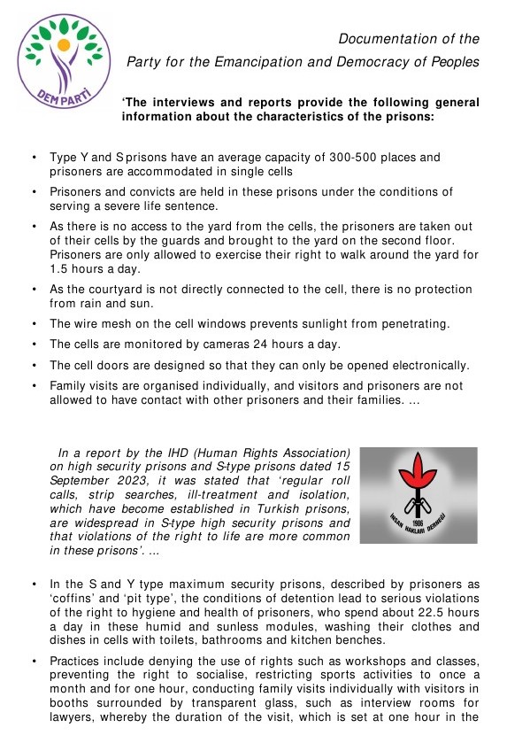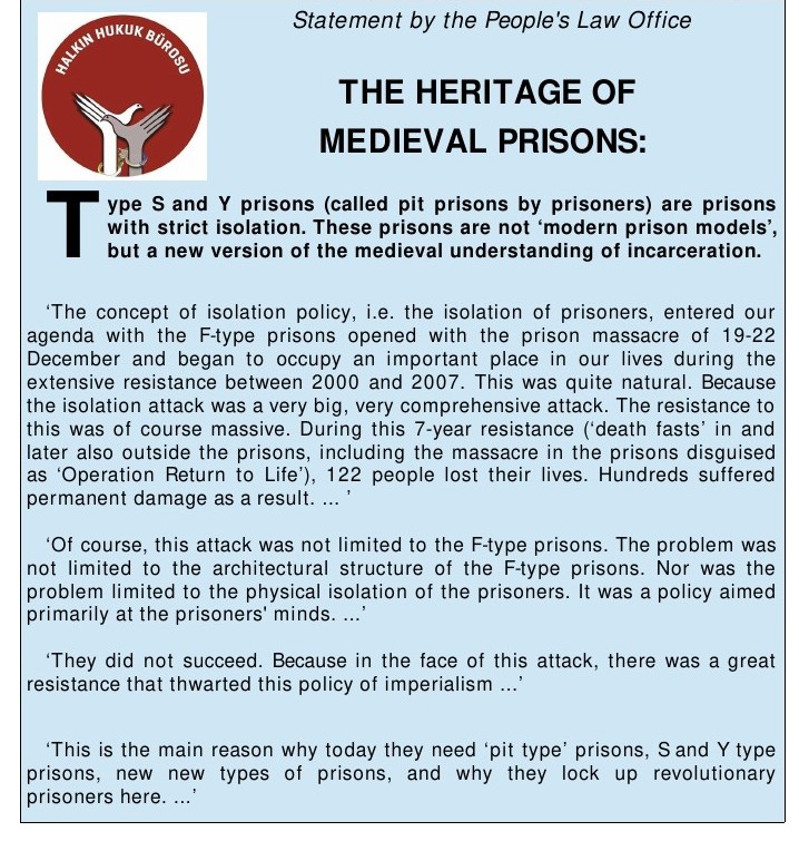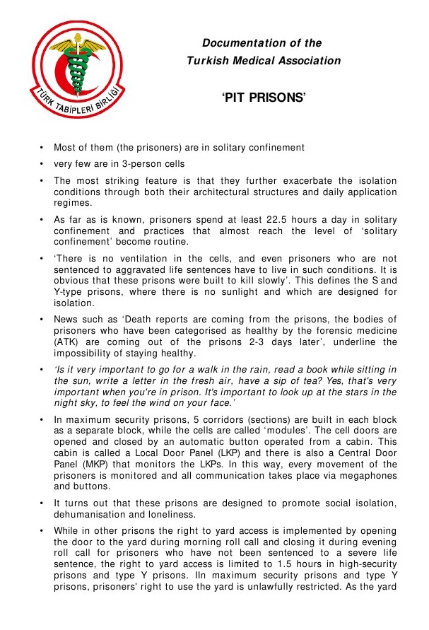In order to give you an idea of what kind of prison or lock-up model the type S, R and Y prisons are, we have translated or summarised statements and documentation from committed lawyers, doctors and human rights associations as well as letters from prisoners held in the so-called ‘pit prisons’ from Turkish.