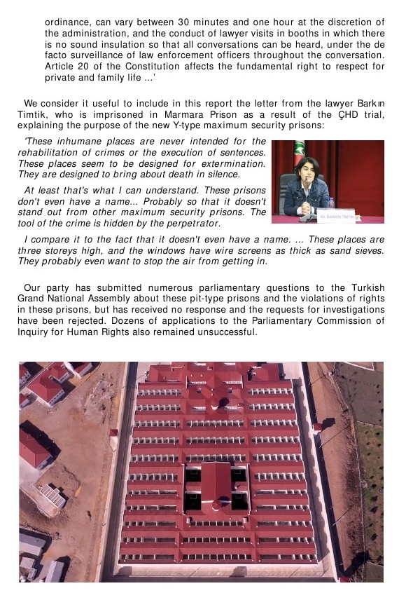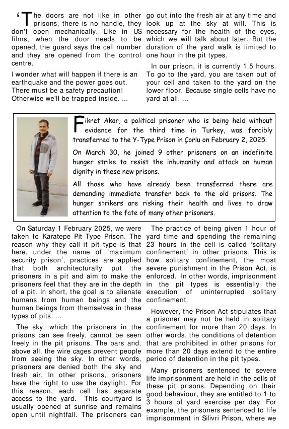 There are a total of 51 of these new prison types in Turkey. Prisoners refer to them as pit-type prisons because they hardly get to see a bit of sky, a breeze or living creatures. They feel as if they have been thrown into a pit.