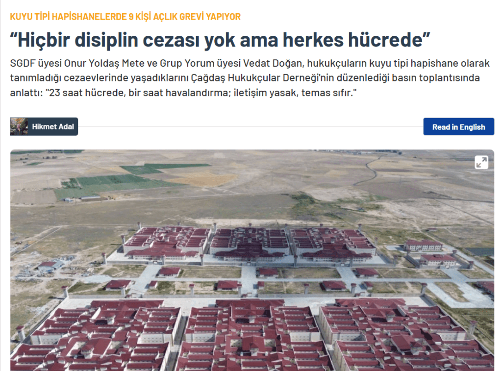 Onur Yoldaş Mete (SGDF) and Vedat Doğan (Grup Yorum) shared their experiences in what lawyers call ‘well-type’ prisons during a press conference by the Contemporary Lawyers Association (ÇHD). They described conditions as: “23 hours in a cell, one hour of ventilation – no communication, zero contact.”