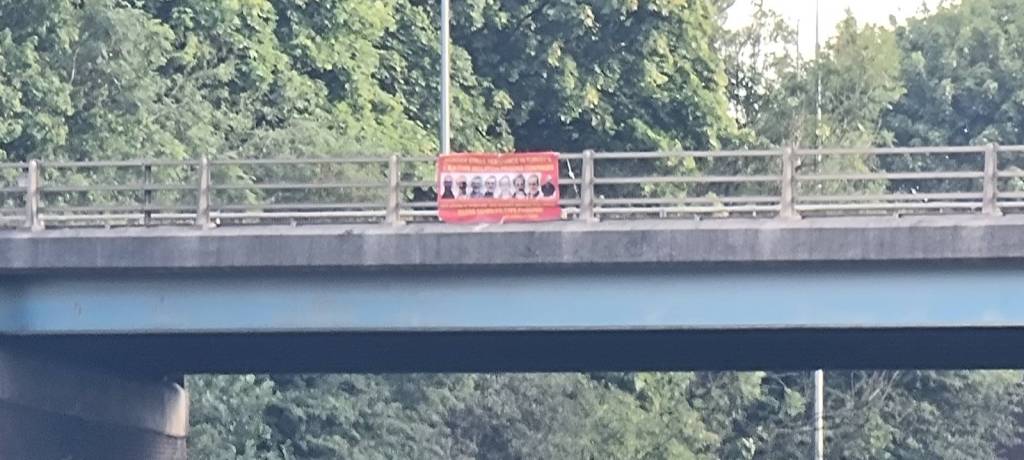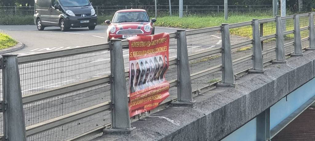 A banner reading “HUNGER STRIKE RESISTANCE IN TURKEY’S ISOLATION PRISONS CONTINUES. ISOLATION IS TORTURE, SOLIDARTIY BREAKS ISOLATION. CLOSE DOWN PIT-TYPE PRISONS” was hung over the M6 motorway bridge near Manchester, England.