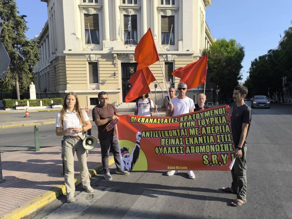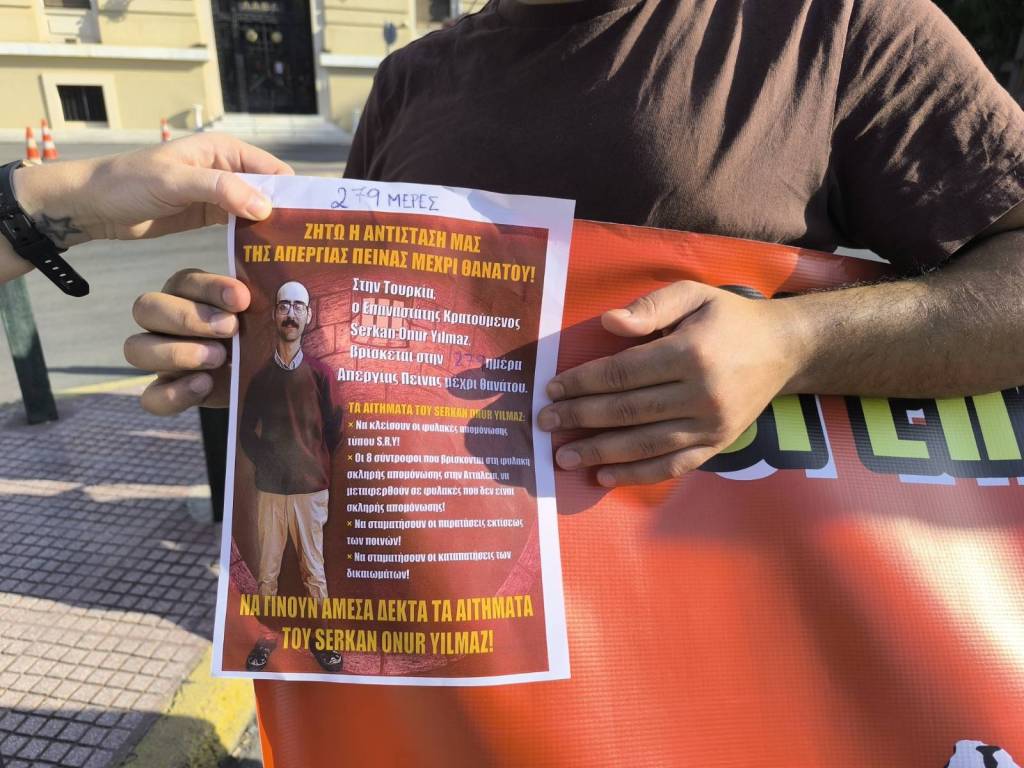 In Athens a gathering was organized in front of the embassy of Turkey today, in order to support the political prisoner Serkan Onur Yilmaz, who is on death fast for 279 days to resist isolation prisons of type S,R and Y (pit-types).