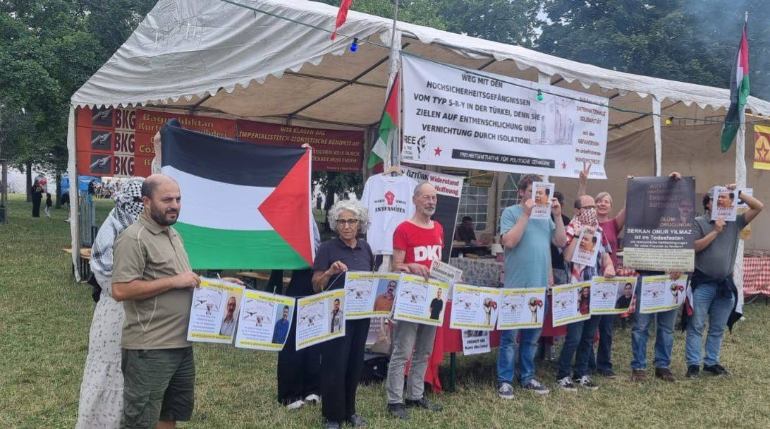 During the festival a solidarity photograph was taken together with comrades of Red Flag, DKP and the Palestinian Solidarity movement, to support the demands of the 11 prisoners on hunger strike/death fast, carrying their posters, including a large banner of death fast resister Serkan Onur Yilmaz. Further, a short statement was made to these organisations to inform about the character of pit-type prisons and to explain the importance of resistance to this imperialist project towards revolutionary prisoners and the opposition as a whole.