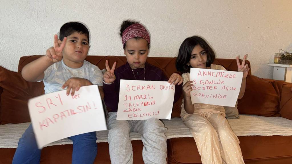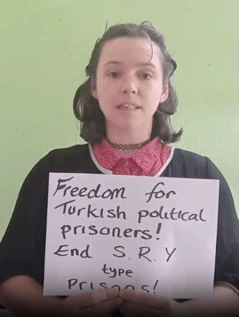 Sevgi from Switzerland made a 3-days solidarity hunger strike for the death fast resisters Serkan Onur Yilmaz and Ayberk Demirdögen, as well as for the other prisoners on hunger strike against pit-type isolation prisons. On the posters carried by her children it is written: “Shut down the S, R, Y prisons”, “Accept the demands of Serkan Onur Yilmaz” and “Our mother is also on a 3-days support hunger strike”.