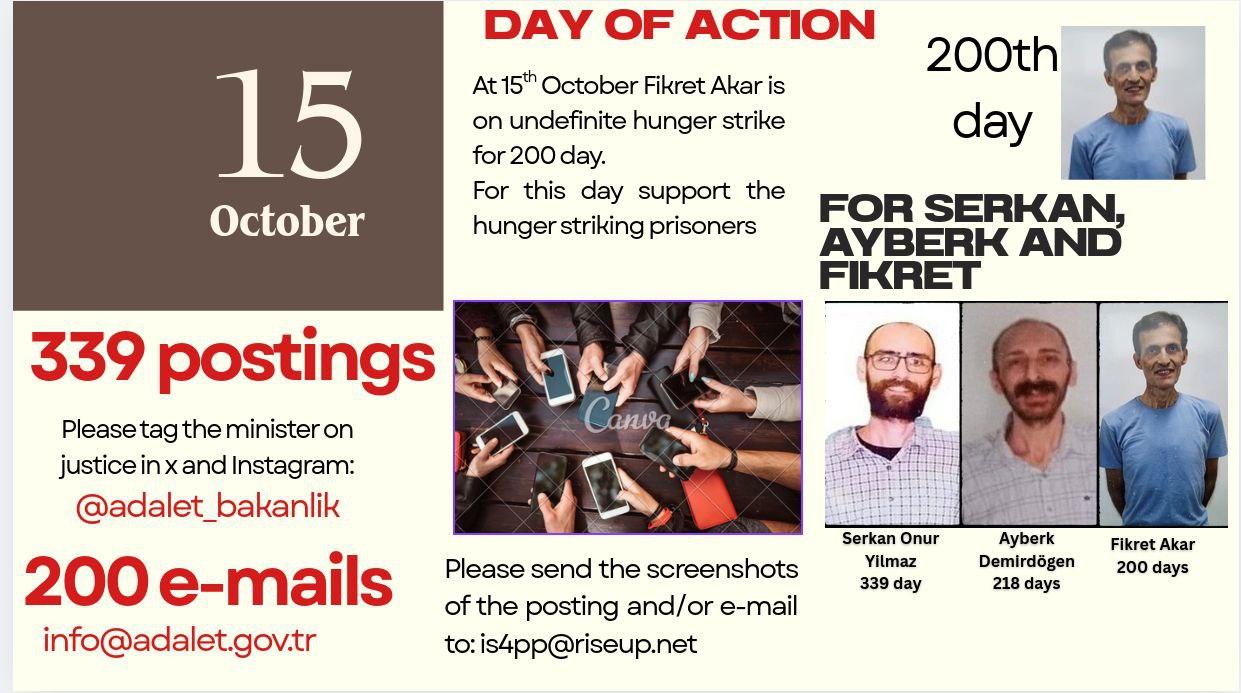 On October 15, the 200th day of Fikret Akar’s indefinite hunger strike, protests, one-day international support hunger strikes and various forms of solidarity actions will take place in different countries.