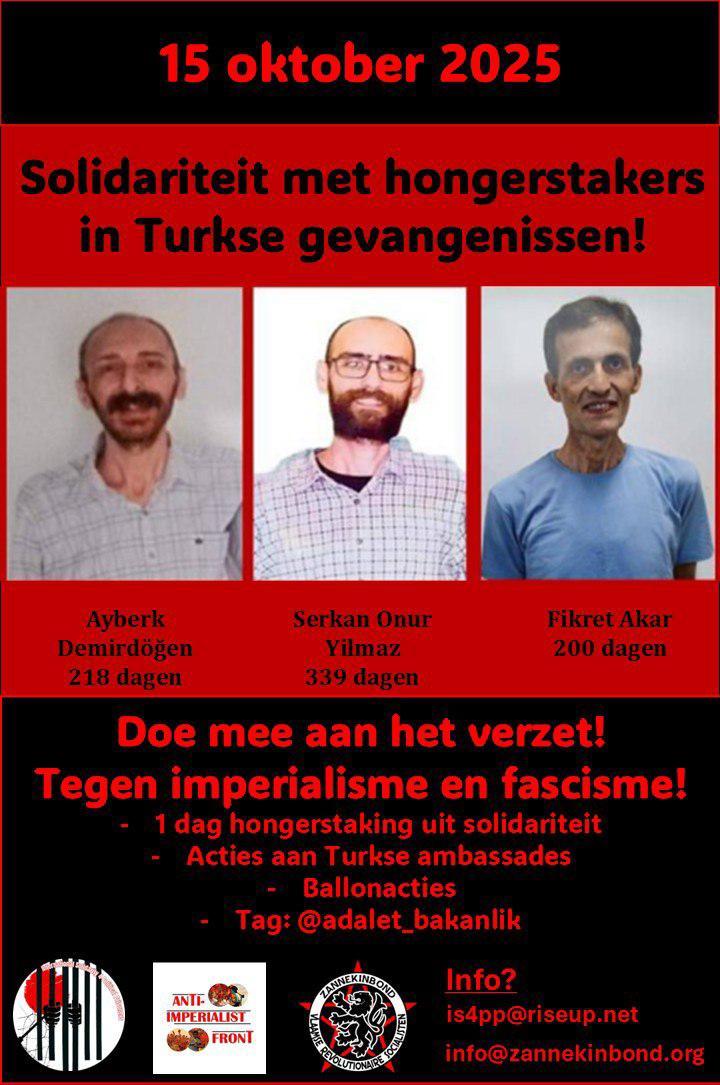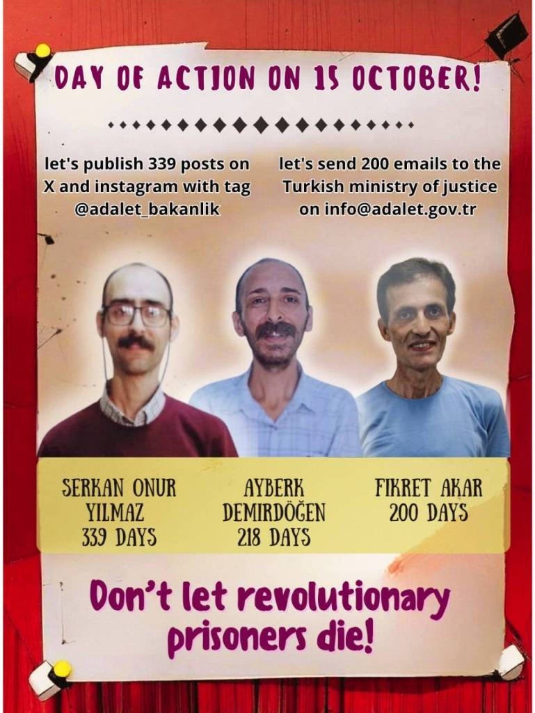 While the resistance of prisoners against these inhuman prison types is quickly advancing, 3 hunger strike/death fast resisters – Fikret Akar (on indefinite hunger strike since March 30, 2025), Serkan Onur Yilmaz (on a death fast since November 10, 2024) and Ayberk Demirdögen (on a death fast since March 11, 2025) are in very serious conditions.