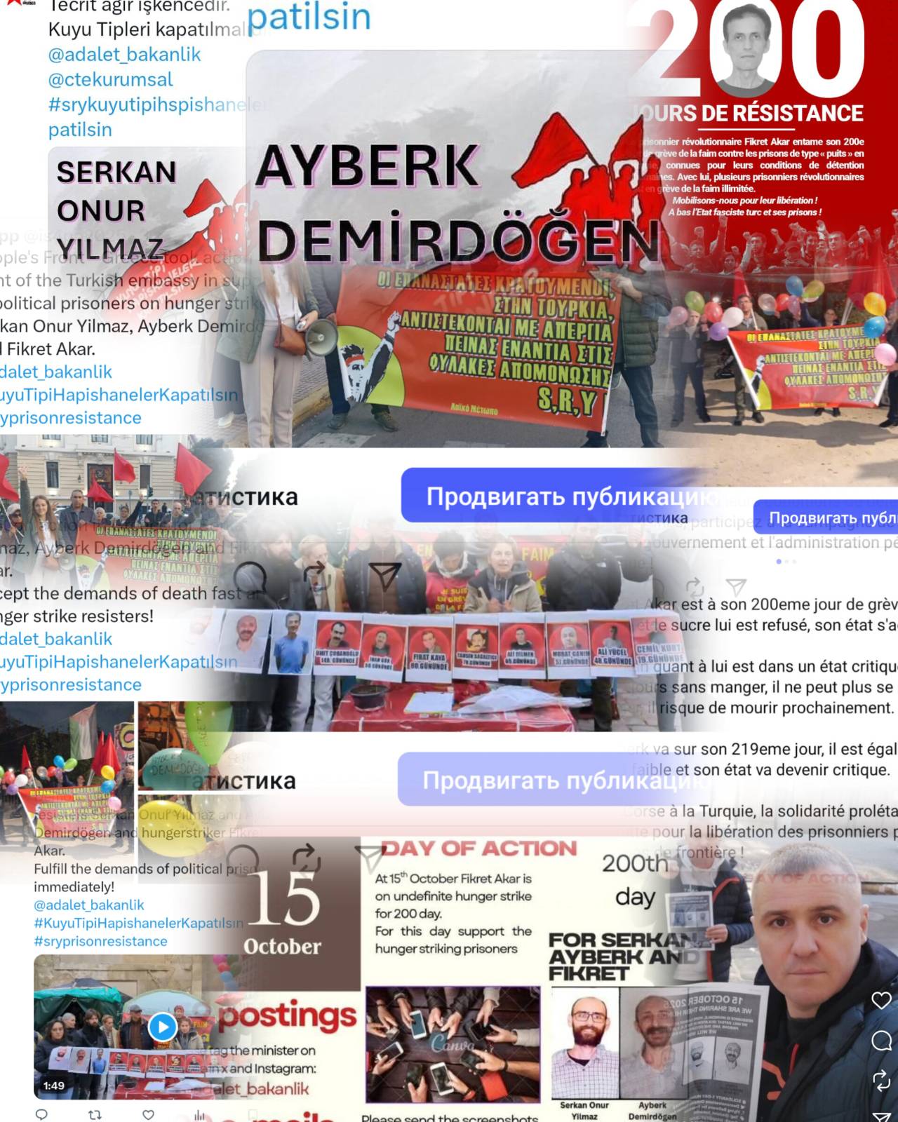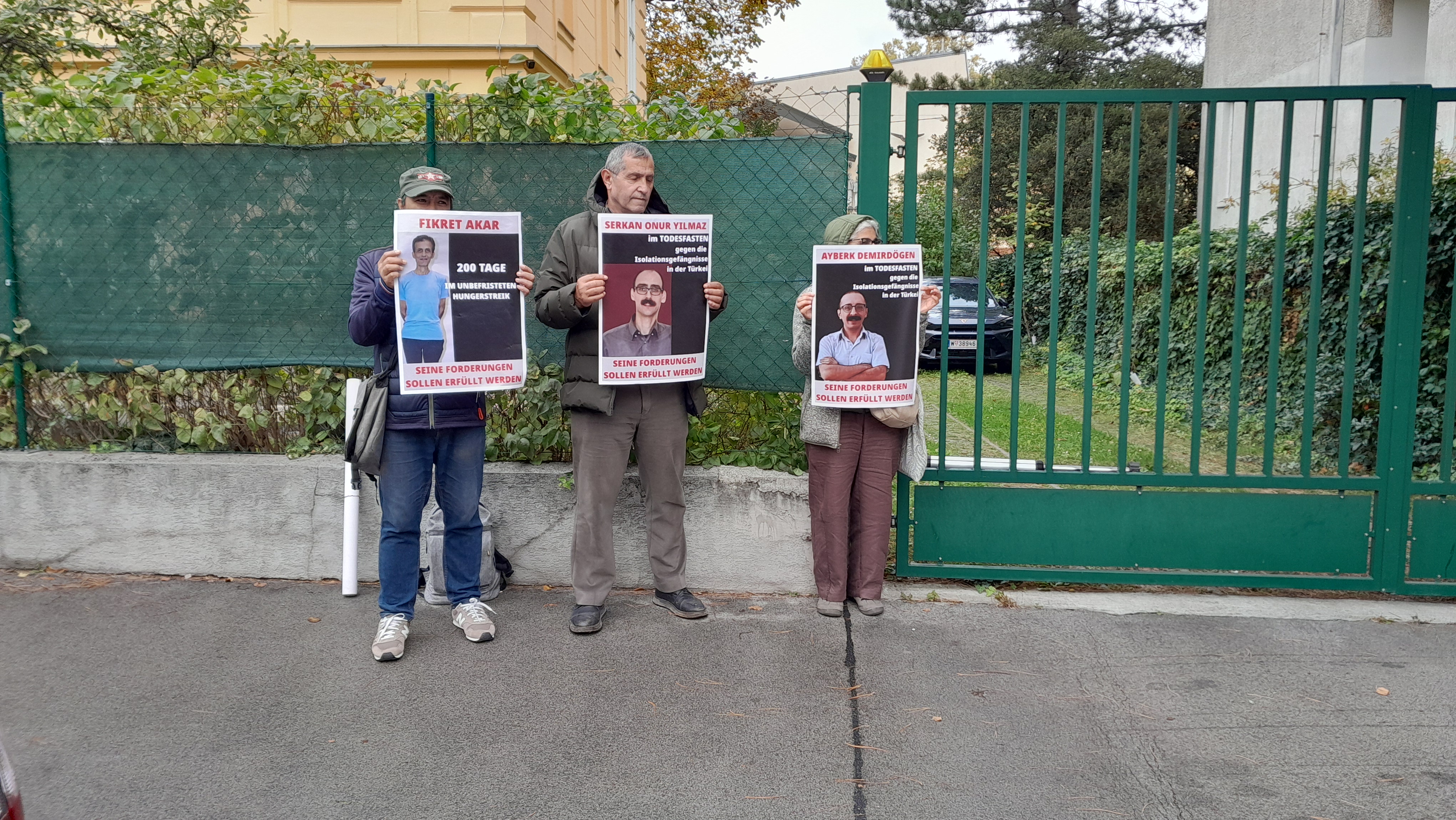 In support of the demands of the hunger striking prisoners, rallies were organized in front of embassies and general consulates of Turkey in different cities with the posters of Serkan Onur Yilmaz (on death fast for 339 days), Ayberk Demirdögen (on death fast for 218 days) and Fikret Akar (on indefinite hunger strike for 200 days)
