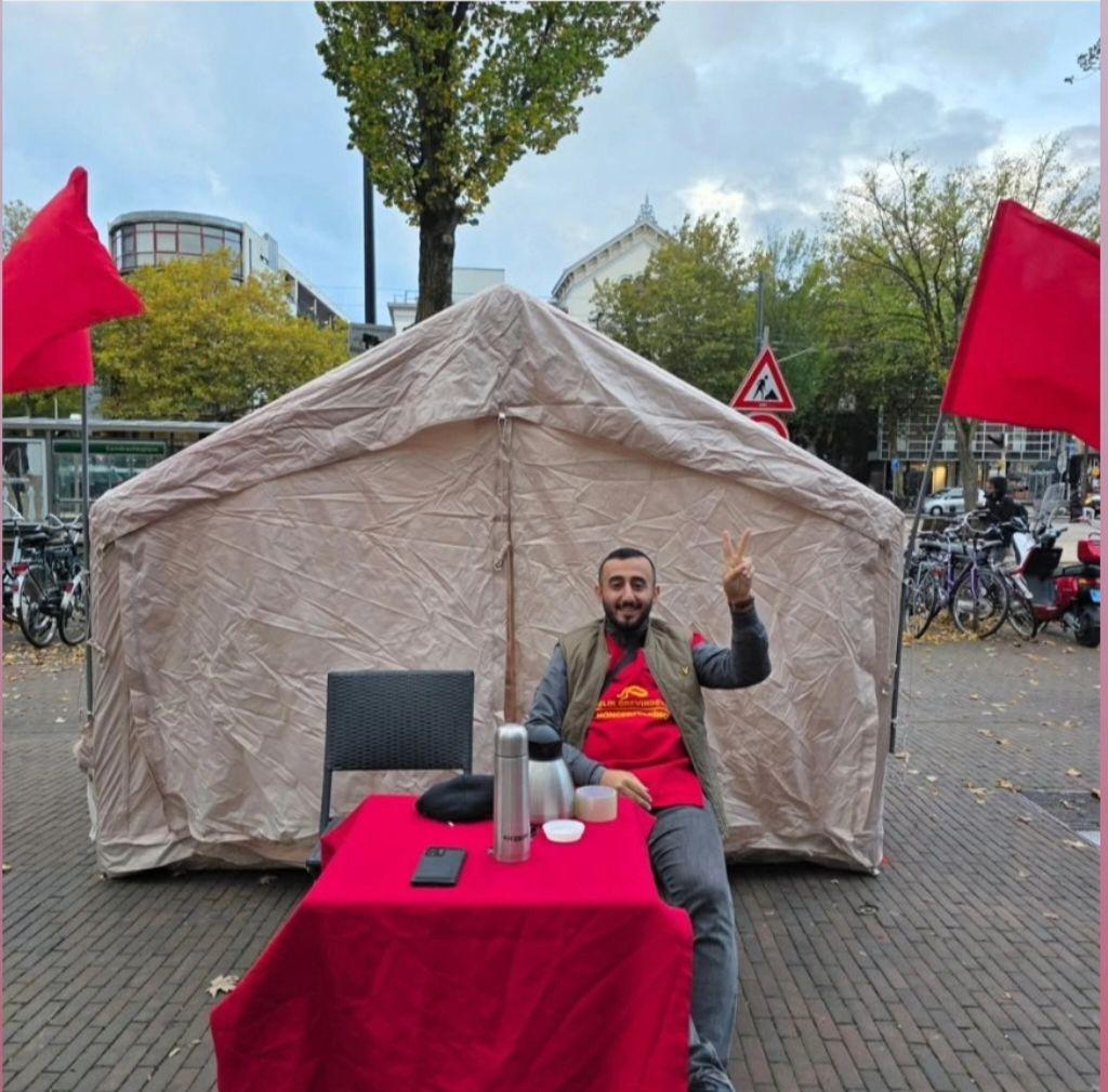 12 days ago, on October 10, Ahmet Cicek started with a solidarity hunger strike and he makes his action visible with a vigil and a tent at the Eendrachtsplein in the city of Rotterdam, which is being installed daily from 10.00 a.m. to 8.00 p.m.