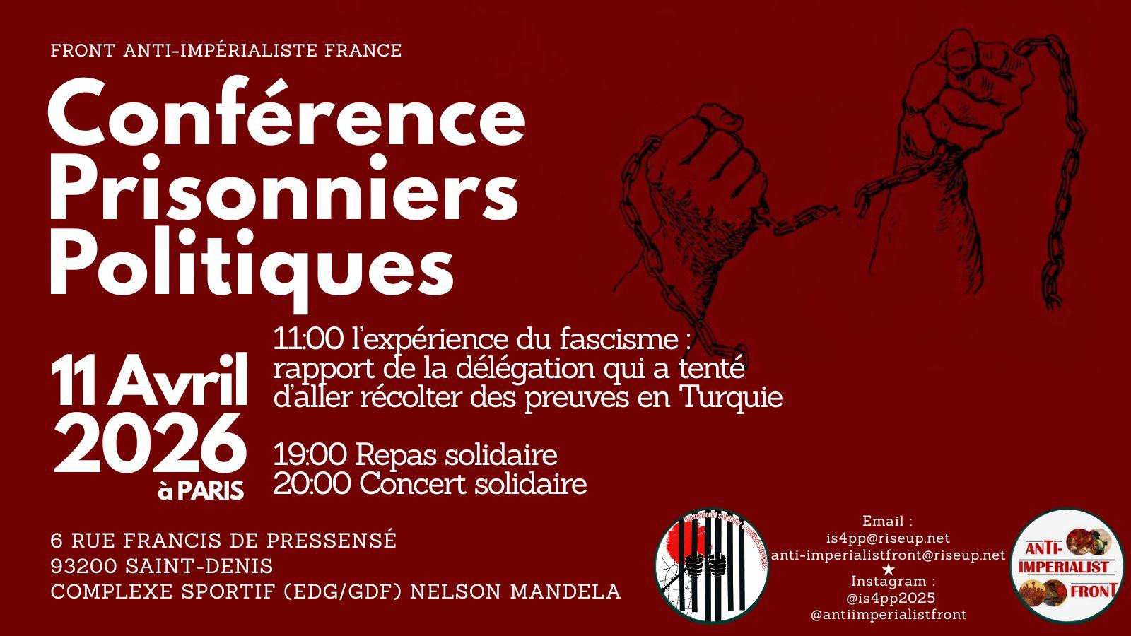 This is the first poster for the international Political Prisoners Conference, which will be organized by IS4PP and AIF France on the 11th of April 2026 in Paris.