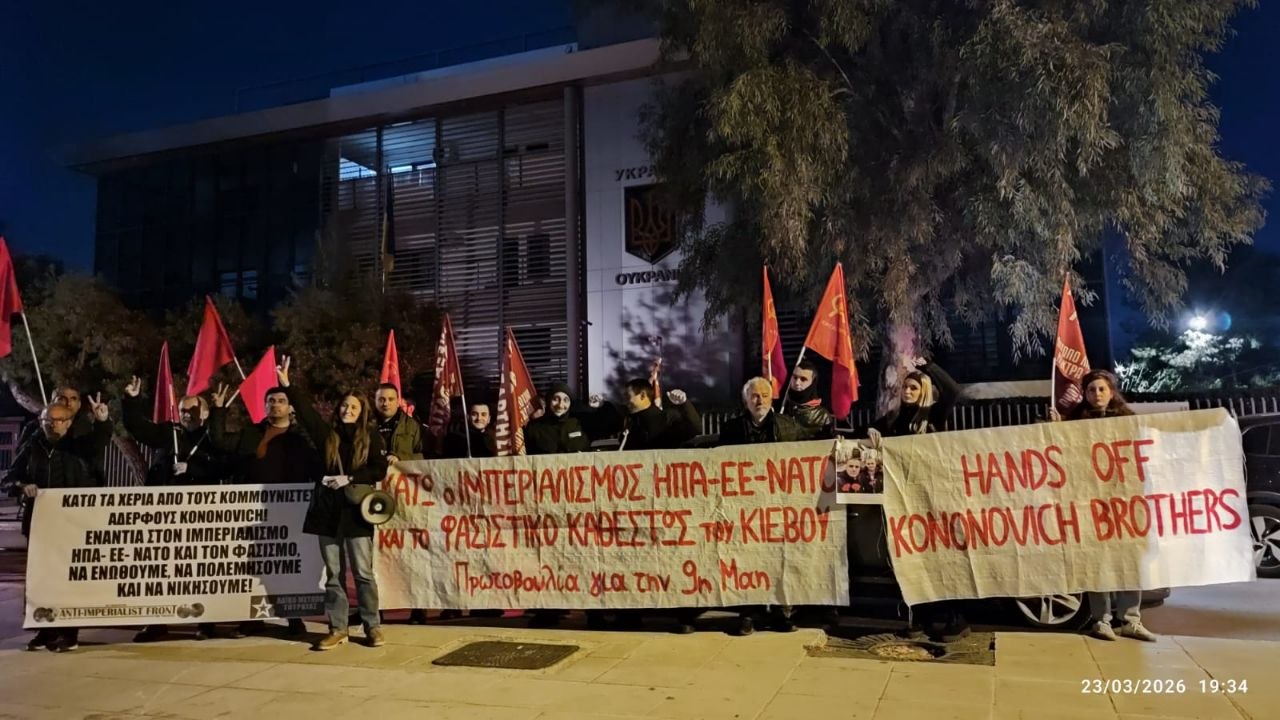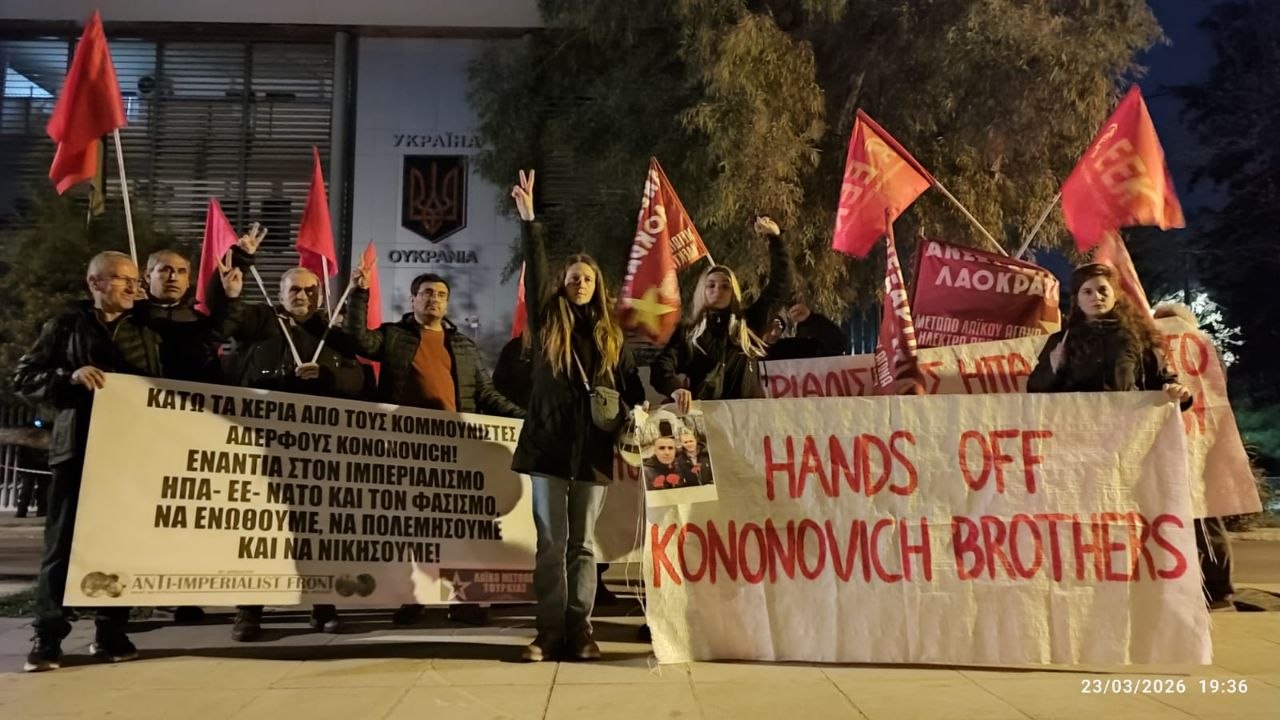 Gathering in Front of Ukrainian Embassy in Athens/Greece for Antifascist Brothers Kononovich took place on 23 March. According the urgent international call made by Anti-Imperialist Front and Initiative for 9th May for communist brothers Kononovich people of different organisations joined the call.
