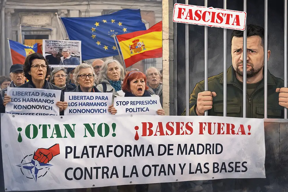 On 19 March, the Madrid Platform against NATO and Bases called an emergency rally in front of the Ministry of Foreign Affairs in response to Zelensky’s visit to Spain. The event aimed to express outrage at the Spanish government’s continued funding of the neo-Nazi Ukrainian regime. Participants held placards in defence of the Kononovich brothers and chanted: “Zelensky is a fascist and a terrorist!”