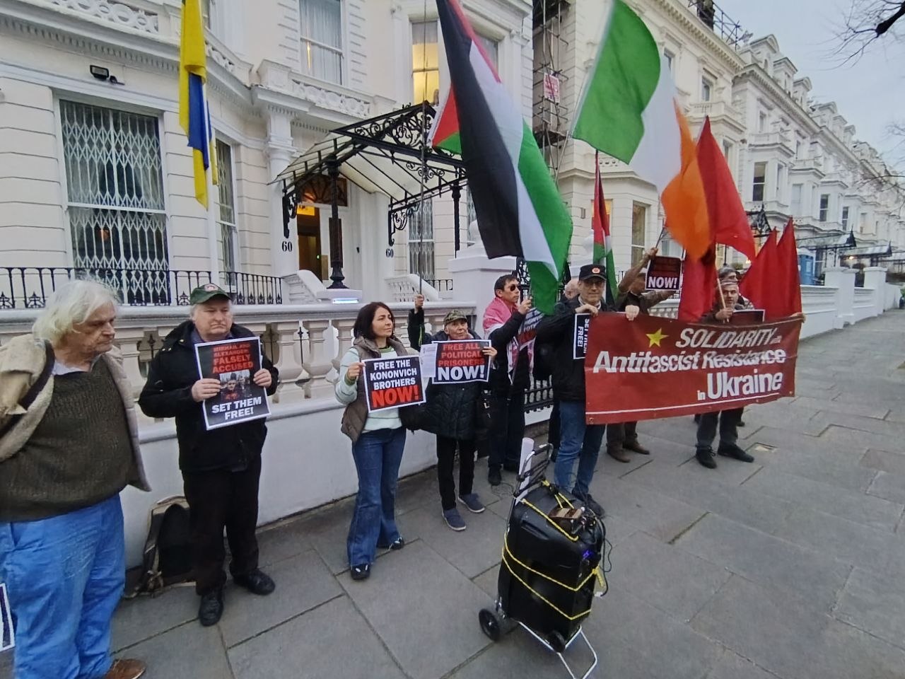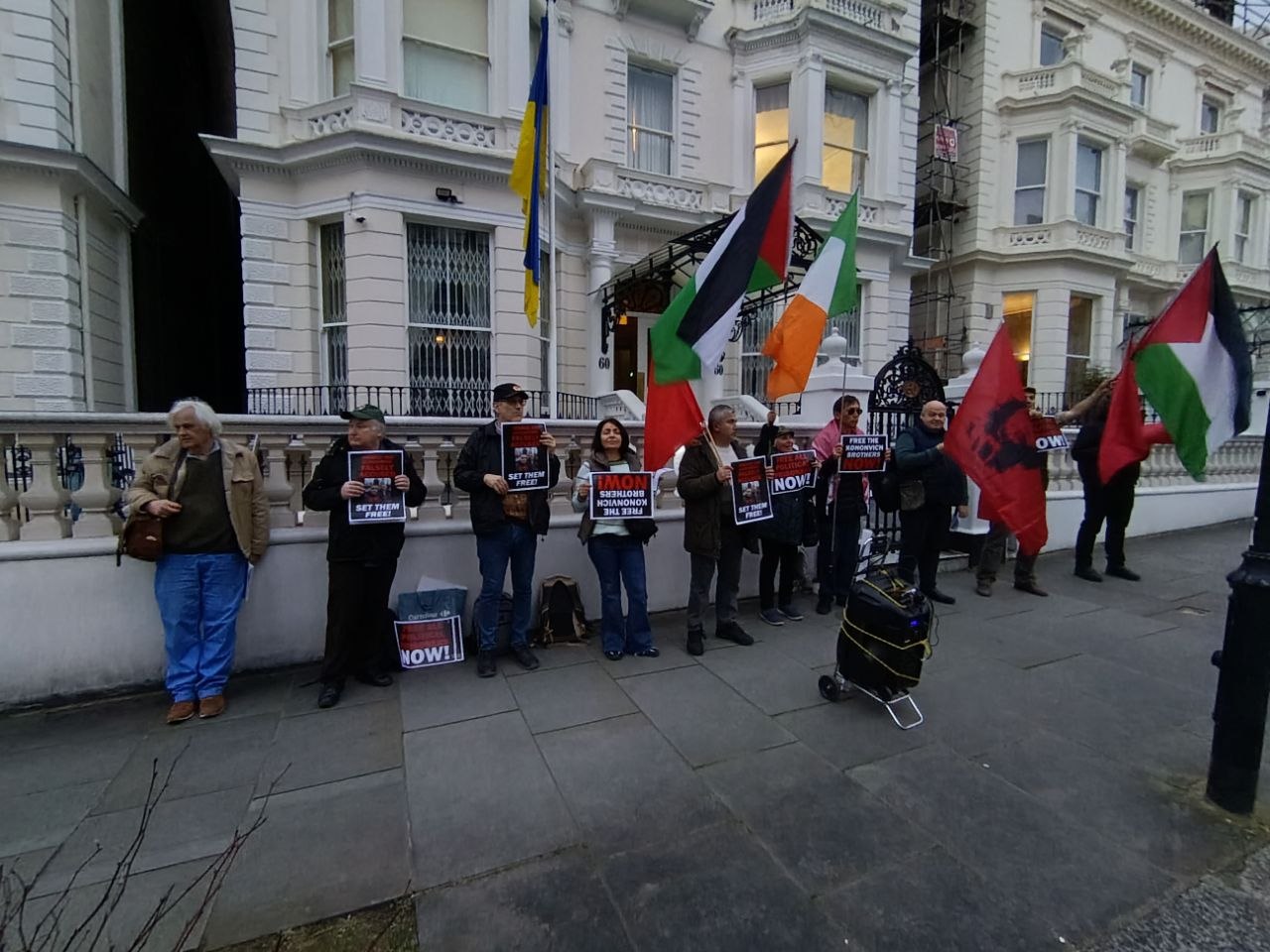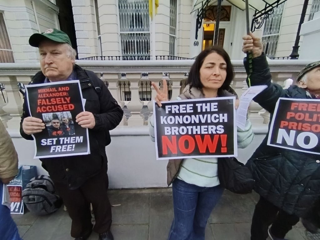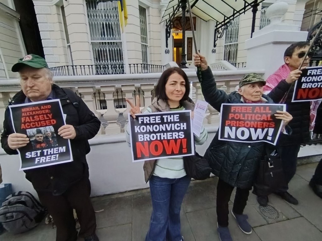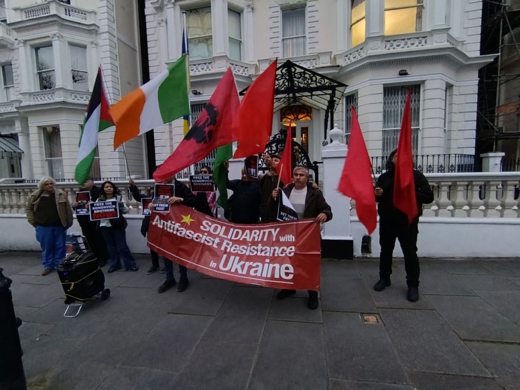 On 20 March, the Anti-Imperialist Front and the Popular Front, together with the organisation International Ukrainian Antifascist Solidarity, held an emergency protest outside the Ukrainian Embassy in London, demanding an end to all state repression against Mikhail and Alexander Kononovich and calling for guarantees of their safety.