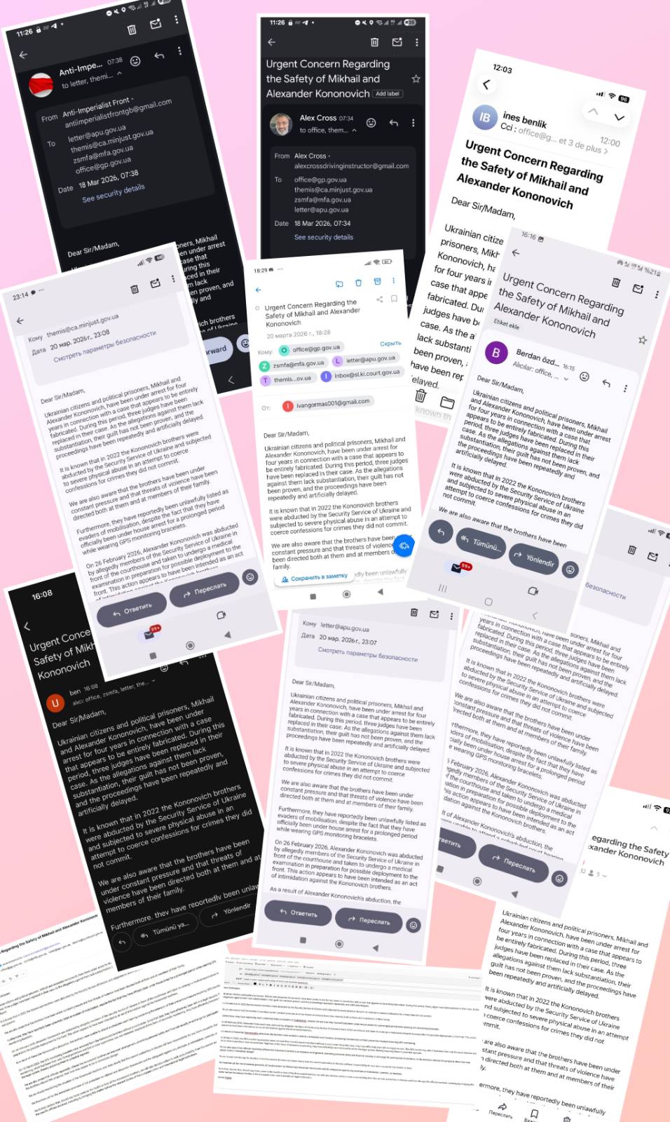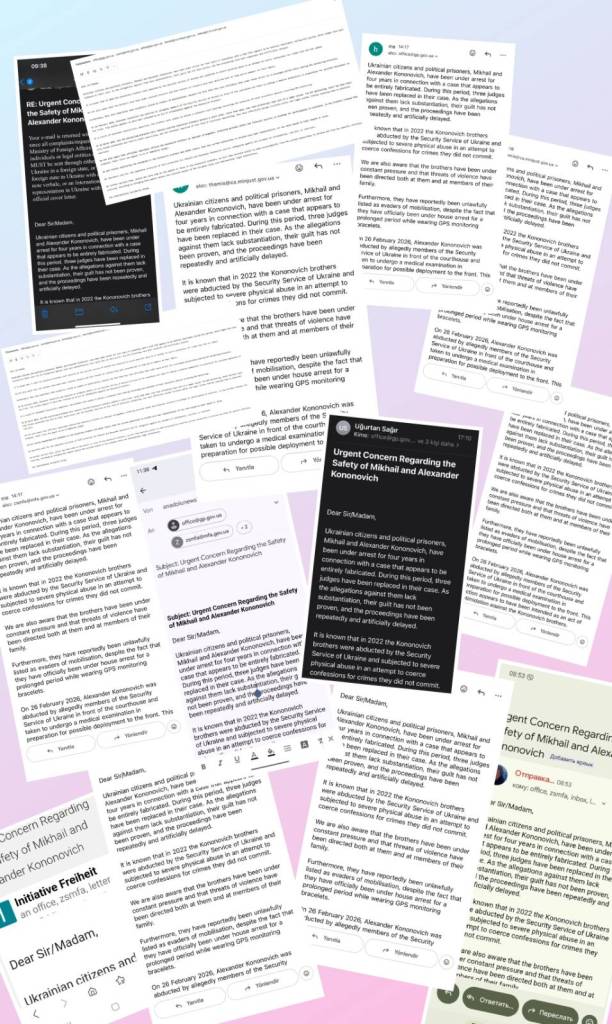 In addition to these demonstrations, a collective email was sent to the official authorities of Ukraine, calling for the immediate and full protection of Mikhail and Alexander Kononovich, as well as for measures to prevent any attempts at intimidation, coercion or repression.