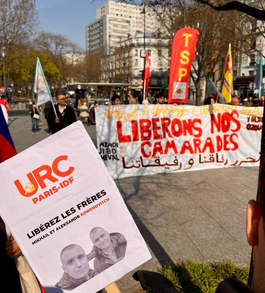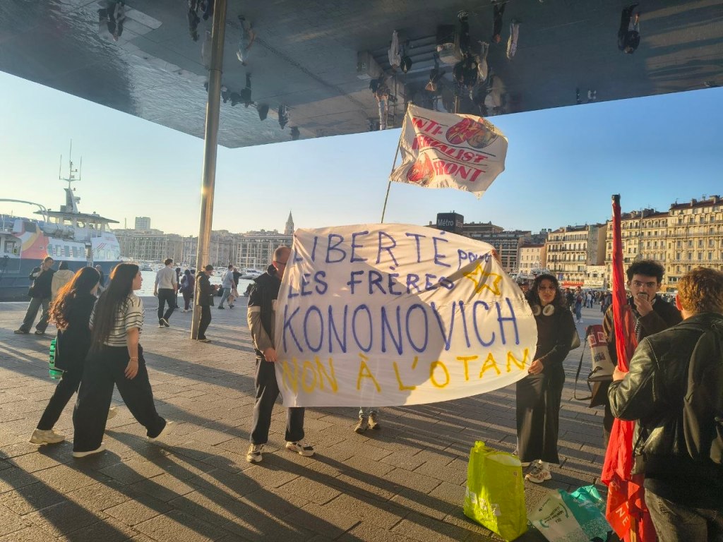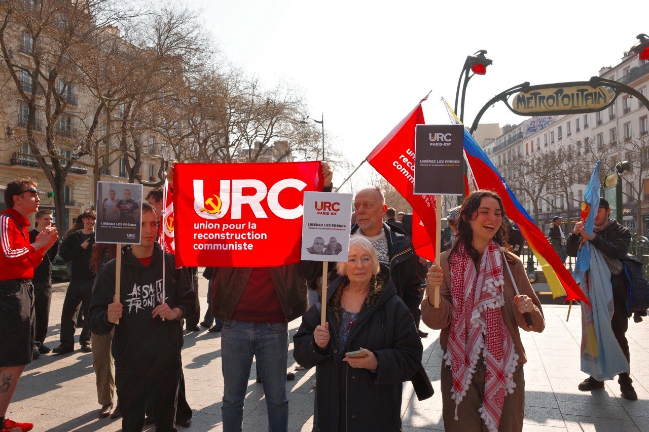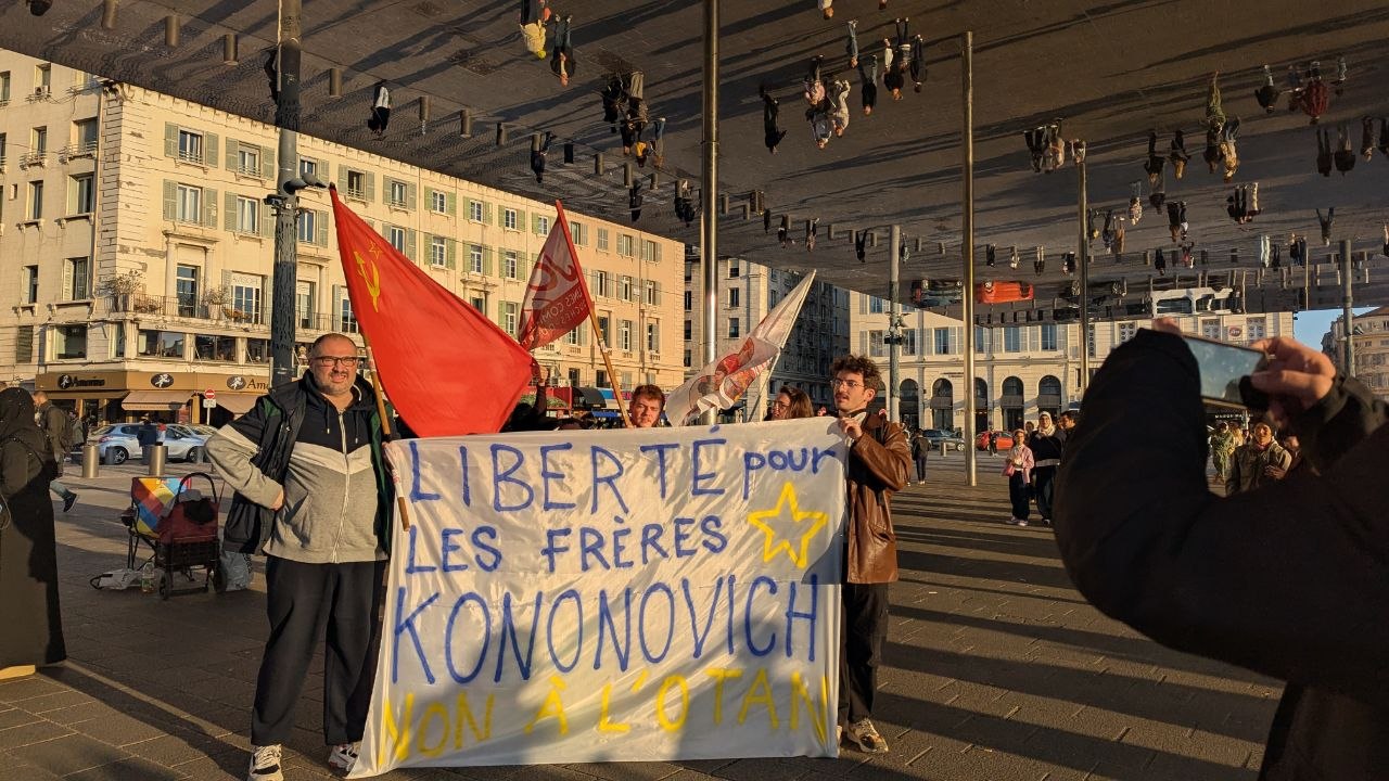 In Marseille, a rally was organised, with Organisation Communiste de France (OCF), Jeunes Communistes (JC), Union pour la Reconstruction Communiste (URC), and Anti-Imperialist Front France responding to the call for solidarity with the Kononovich brothers. Speeches were delivered expressing solidarity, while also addressing the Russophobia faced by communist organisations in France and the ways in which imperialist propaganda is exploiting the war between Ukraine and Russia to advance its own agenda. Activists reminded attendees that the Kononovich brothers have faced fascist repression by the Ukrainian state for four years, and that their situation is now more critical than ever, with their safety directly under threat.