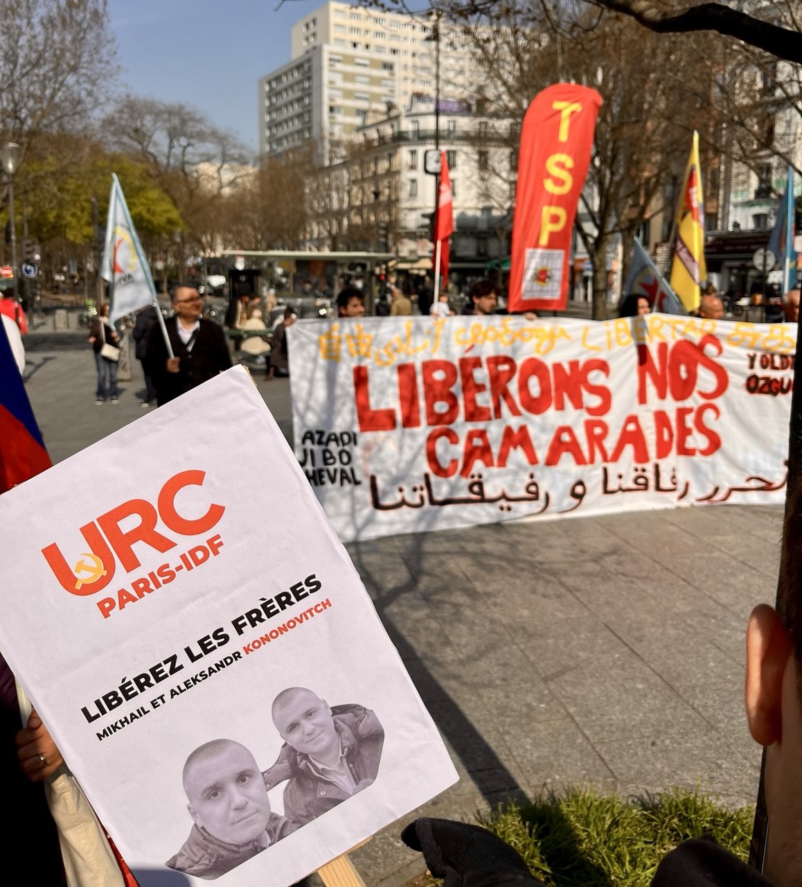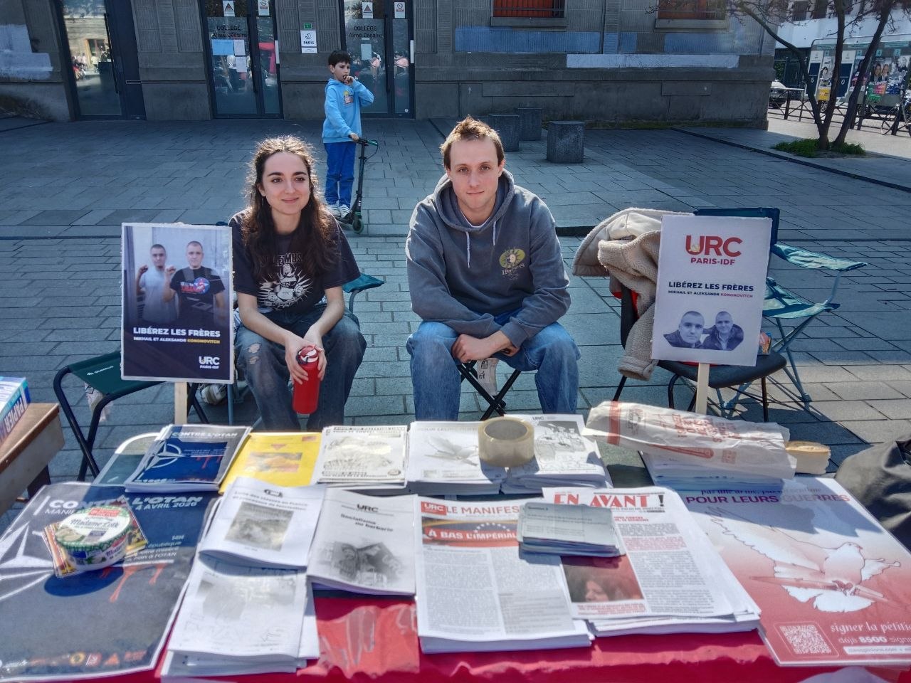 In Paris, two separate actions took place. Firstly, the URC participated in a demonstration for political prisoners worldwide, where they spoke out and distributed leaflets in support of the Kononovich brothers as a symbol of repression against popular resistance globally. Secondly, the URC took part in a street meeting in northern Paris against war and imperialism, where activists set up an information stand to raise awareness about the case of the Kononovich brothers.
