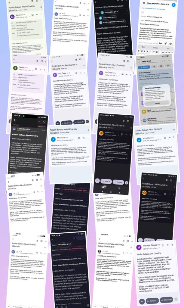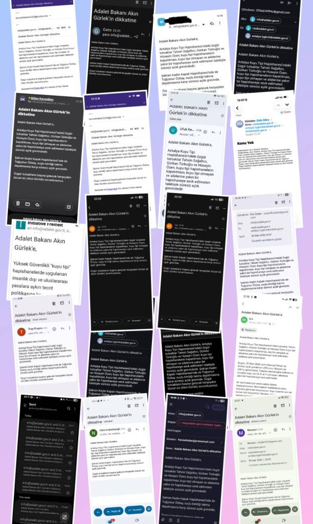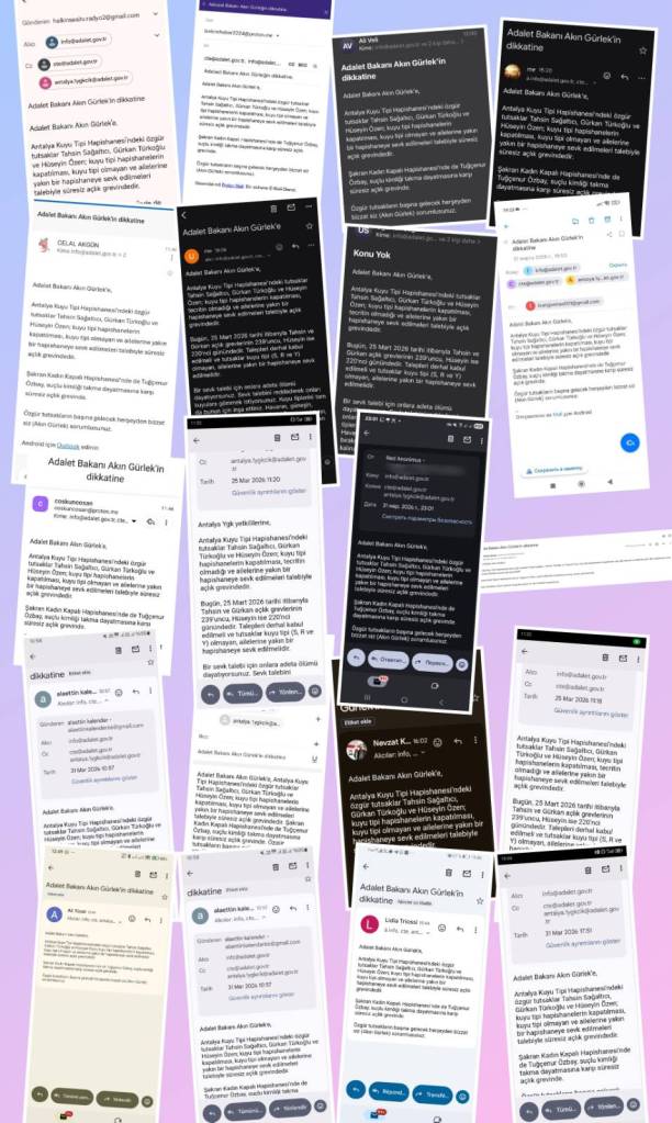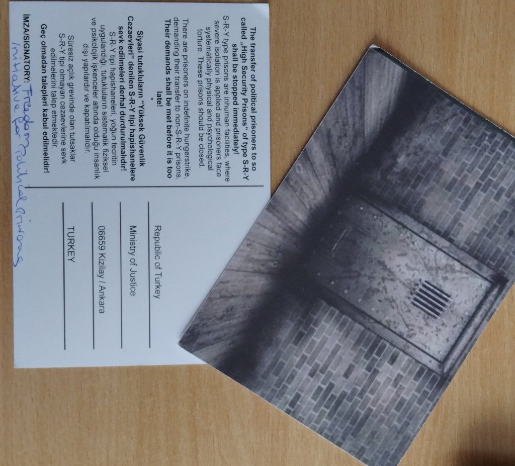 The campaign in support of prisoners resisting the isolation prisons of S, R and Y in Turkey continues on a weekly basis. In addition to one-day solidarity hunger strikes, people send messages to the Antalya prison administration and the Ministry of Justice to remind them of their responsibility for the prisoners’ lives. Letters are also sent to the hunger strikers to let them know that their demands are supported by people outside.